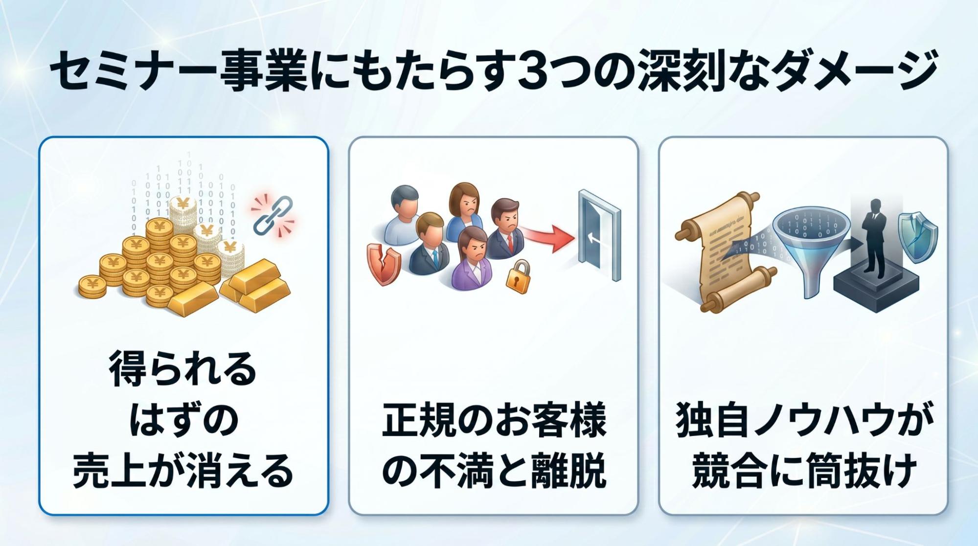 その結果、クレームに繋がるだけでなく、「この人のセミナーには二度とお金を払わない」と静かに離れていってしまいます。目先のタダ見以上に、大切なお客様からの信頼を失うことは、事業にとって最も大きな痛手となります。